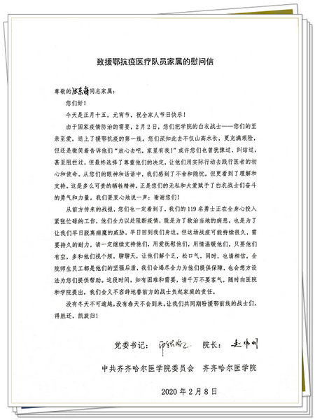 医学院党委书记顾长虹、院长赵炜明致援助武汉医疗队员家属的慰问信