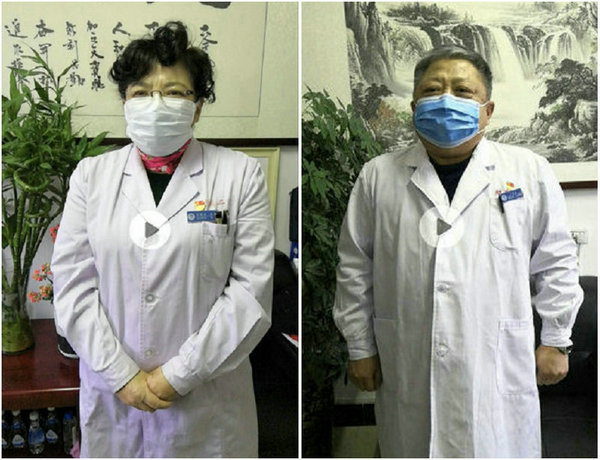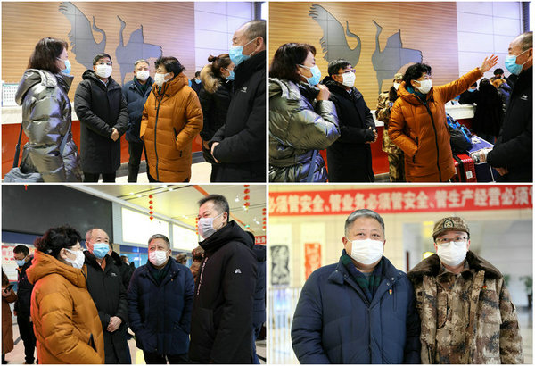 医院院长张淑英(左)、党委书记丁国旭(右)为出征武汉医疗队员送上元宵节美好祝福
