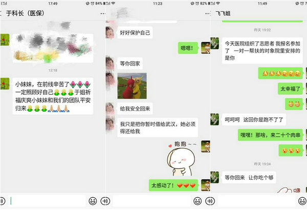 每次结束工作,我都会在朋友圈报一下平安出仓,让远在两千多公里的家人、领导、同事和朋友们安心。自出发到现在,每天都会收到很多关心问候的信息:降温了,多穿衣服,多吃饭,好好休息,保护好自己,才能救更多的人,缺不缺东西,给你邮点营养品……爸爸特意打电话来告诉我,接到医院党委的慰问电话,问问家里有没有困难,我告诉他真有困难可以说,爸爸却说:既然我们选择无私奉献、救死扶伤,尽量不要给医院填麻烦!家里都好,放心吧!