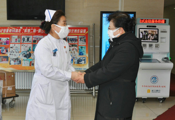张淑英院长代表医院感谢冯春玲护士长一家的深情厚谊,她表示,彭程先生的拳拳赤子之心和的可贵的家国情怀,不仅温暖了附属二院每一位职工的心,鼓舞了士气,也为医院的防疫工作取得全面胜利作出了积极贡献。张院长说,在彭先生的爱心举动中,蕴含了祖国母亲的血脉深情和红色基因,深藏了父母的言传身教和谆谆教诲。感谢彭程先生的爱国之心,感谢冯春玲护士长及其爱人的培养教育,向冯春玲护士长全家致敬。