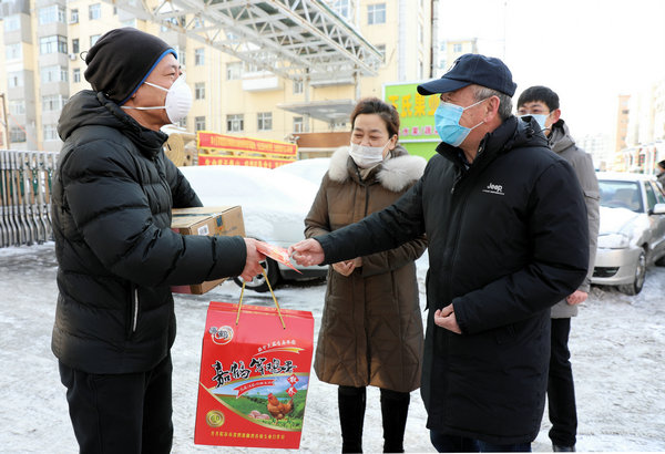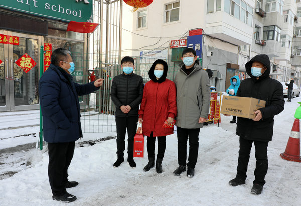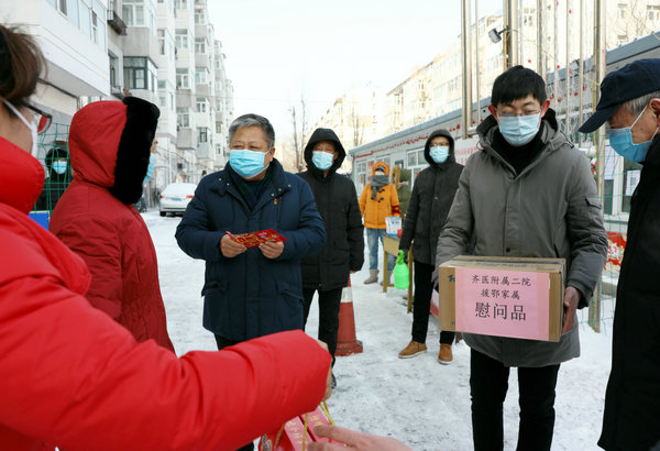 二月二龙抬头,收到祝福好兆头。2月22日9时,值此我国传统节日二月二来临之际,党委书记丁国旭、纪委书记胡晓强、副院长赵玉环组织带领关爱抗疫一线职工家庭志愿者服务队,走访慰问了出征武汉、哈尔滨抗疫前线的家属,为他们送上了500元慰问金以及猪头肉、牛肉、笨鸡蛋、糕点等生活物资,将党委的关心、支持与帮助送到了每个出征队员及家属心中,以此表达医院党委对全体出征队员满满的关爱和敬意。