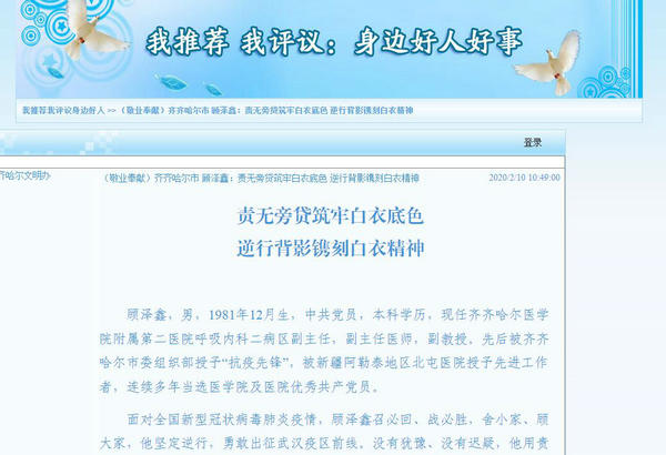 近日,省文明办主办了“我推荐、我评议身边好人”活动,援鄂抗疫医疗队员、呼吸内科二病区主任顾泽鑫以其典型事迹光荣入选2月份“龙江好人”敬业奉献类候选人。