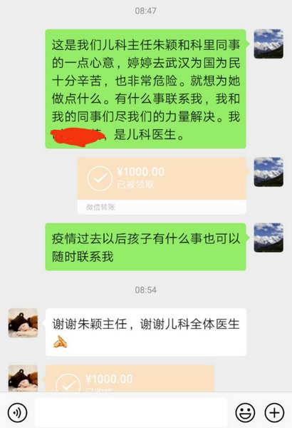 儿科主任朱颖援助鄂婷婷家属1000元