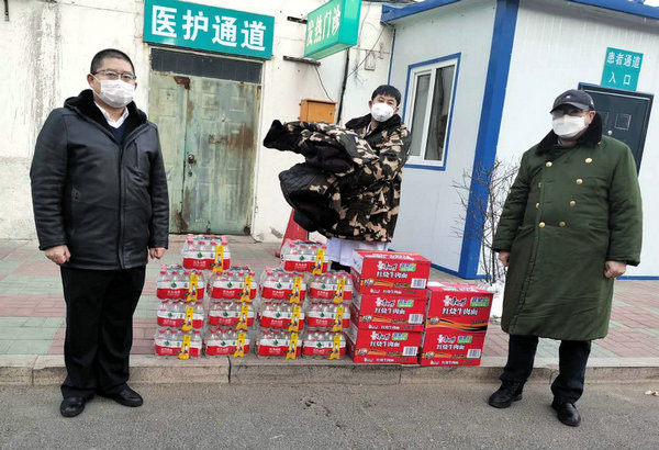 2月20日上午周扬为彩虹街道南市场社区捐赠5箱2200个爱心饺子和5箱康师傅大碗面、心相印纸抽10包,消毒洗手液2瓶、迷彩军大衣1件、农夫山泉矿泉水3箱、隔离无菌手术衣4件为卡口值班人员防护及生活用品提供便利。