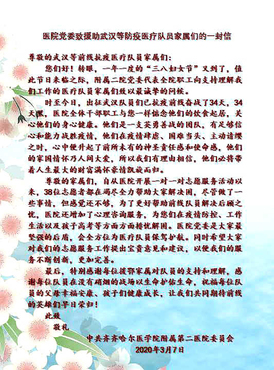 【战“疫”进行时】医院党委致援助武汉等防疫医疗队员家属们的一封信
