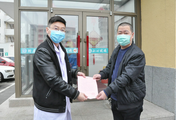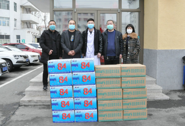 3月18日上午,齐齐哈尔市新祺源物业管理有限公司向我院捐赠20箱消毒液,助力医院疫情防控。院办负责人孙超宇代表医院接受捐赠并致感谢信。
