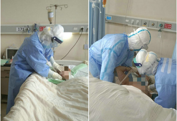 援助武汉医疗队员孟庆爽在舱内护理病人