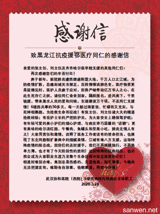 武汉协和医院(西院)6楼西神经内科病区全体职工致黑龙江抗疫援鄂医疗同仁的感谢信