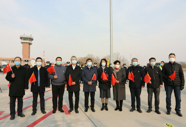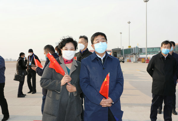 医学院党委书记顾长虹、院长赵炜明、副院长毕红霞等领导干部职工到机场迎接援鄂队员