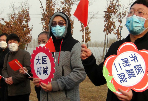 院副院长赵玉环(右二)等干部职工热烈欢迎医疗队员平安凯旋