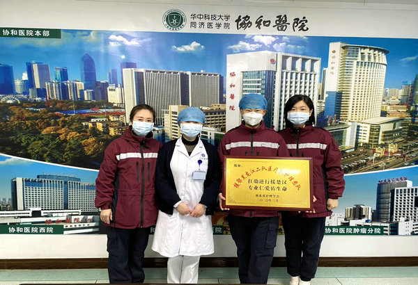 黑龙江省第二批援鄂医疗队护理组组长、我院重症医学科护士长颜红霞(右二)等接受湖北省护理学会赠送牌匾