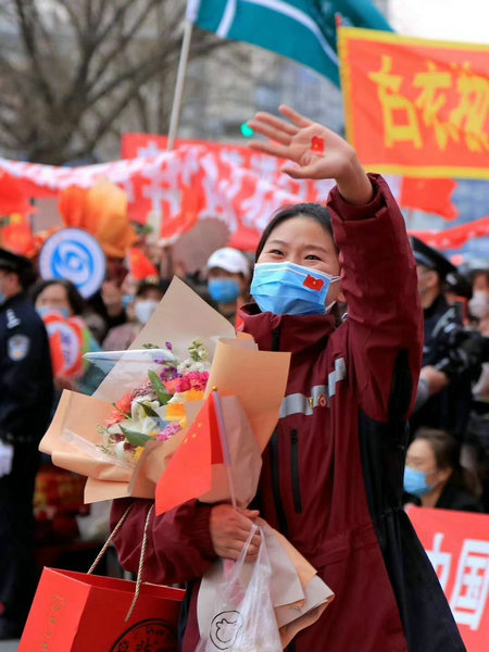 颜红霞护士长说,从2月2日抵达武汉到现在已经57天,如果没有队员们精准的标记,真的不敢相信时间过得这么快。尤还记得刚到武汉时的心情,激动、紧张和担忧都有。看到武汉当时的情况心里说不出的悲凉,一年前来这里时还是个喧嚣的城市,如今街道空无一人,截然不同的两种境况。开年的一场新冠疫情让英雄的武汉生灵涂炭,所有医院人满为患,医护人员日夜奋战。全国42000多名的白衣天使逆行援鄂,没有让武汉孤军奋战,每一天都在上演着与死神的殊死搏斗,每一天都发生着感人的故事,而我们也是其中的一员。90多个日夜啊,生生的将8万的确诊病例降至到了5千多,这是白衣天使们用生命守护生命换来的。每每思及此便眼眶湿润,心中澎湃万千。只有强大的中国,才会有这样的壮举,只有中国医护,才会有这样的胸怀。如今,在大家共同的努力下,圆满完成了任务,感谢大家,感谢院领导、同事和家人的关心和支持。回到家乡的热土上,看到家乡人民夹道欢迎,热烈的庆祝我们归来场景,内心既感到无比的激动喜悦,眼前又浮现出近两个月来在武汉的工作的情景,颇感怀念。热情的武汉人民也给了我们最最真诚的款待,谢谢英雄的武汉,明年樱花盛开我们再见。