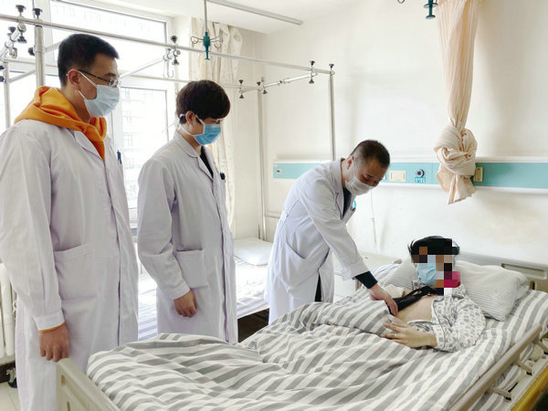 骨外科一病区主任乔洪旺(左三)等查看患者术后情况