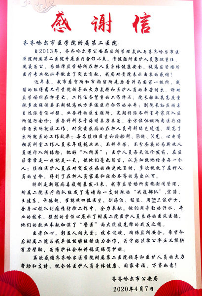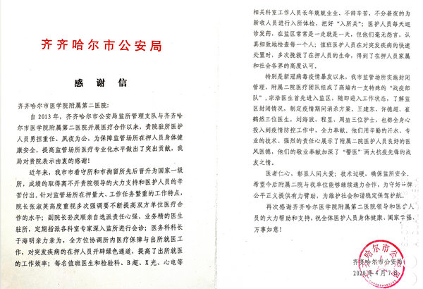 ——齐齐哈尔市公安局监所管理支队向我院赠送感谢信