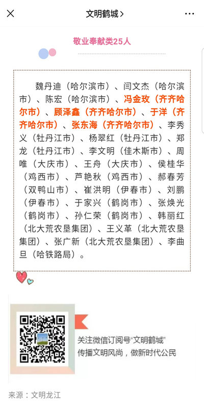 近日,由中央文明办主办、中国文明网承办的“我推荐、我评议身边好人”活动结果已揭晓,在各市(地、系统)文明办核实推荐基础上,经广大网友投票、评议,我院重症医学科主任张东海、呼吸内科二病区副主任顾泽鑫光荣当选敬业奉献类“龙江好人”。