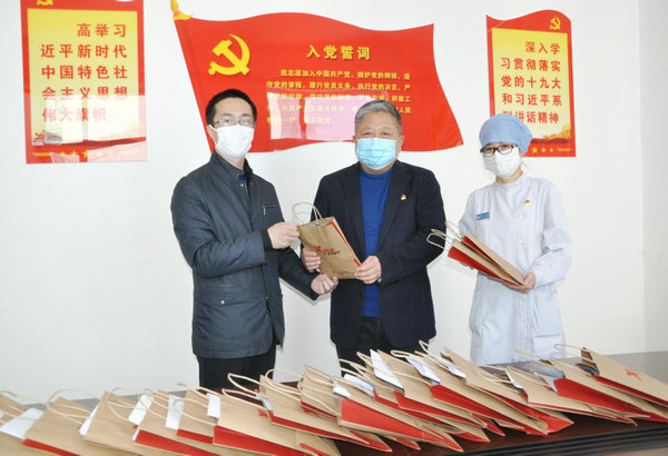4月23日上午,鹤城晚报联合17家鹤城知名企向我院援助武汉医疗队员送温暖,尹伟明主任代表17家企业,为医疗队员每人送上精美爱的心礼品。党委书记丁国旭、援鄂队员孟庆爽代表医院接受捐赠,党办、工会等负责人参加捐赠仪式。