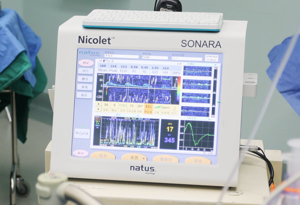 电生理科何冬若主任介绍,经颅多普勒超声术中监测的优点:无创性、简便、可重复的脑血流监测技术;可通过完整的颅骨,经特定的声窗,动态连续监测;实时监测颅内血流动力学变化,及时发现由于夹闭所致的低灌注,指导分流管的放置;及时发现重新开放后的过度灌注;发现微栓子信号(MES)的出现,有效的判断颅内血流是否通畅,狭窄是否解除,开放的交通支是否关闭,及时提示及预警,TCD是目前唯一一项能够实时监测微栓子信号的监测工具。
