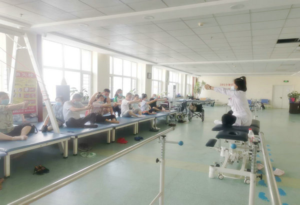 偏瘫体操是通过定期输入全面、正常的运动模式影响输出,从而促进正常功能模式形成,达到运动功能最大限度恢复。康复训练配合偏瘫体操能减少继发合并症,如肩痛、膝反张足内翻等,偏瘫体操对偏瘫患者运动功能的恢复有明显的促进作用。康复医学科在每周六下午都进行体操课的集中训练,为帮助更多的偏瘫患者在空余时间在康复治疗师的指导下主动正确的进行训练。