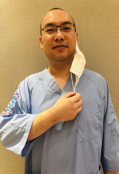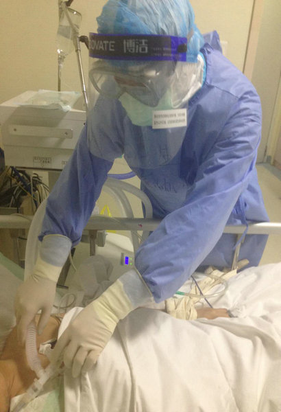 已经在武汉工作很久了,董医生似乎已经开始适应了在武汉工作的高强度,高度紧张的工作状态。今天是白班,他为了能在接下来的6个小时的工作中不上厕所,早饭只喝了两口牛奶,吃了一个鸡蛋。9点进仓交接班、查房,他发现一个刚入院两天的病人病情进展的很快,普通鼻导管吸氧已经不能维持血氧饱和度,必须应用无创呼吸机进行无创通气。为新冠肺炎的病人进行无创通气治疗对医护人员是一个很大的挑战,因为患者会通过面罩呼出大量含有病毒气体,并形成气溶胶悬浮在空气中,大大增加医护人员感染的风险。但是眼看着病人的血氧逐渐下降,董医生顾不上自己的风险,马上给予患者上机治疗。无创呼吸机是需要根据患者的病情变化随时调整参数,也就是说需要医生一边在患者和机器旁边安慰和指导患者,一边调解参数设置。因为担心护士会被感染,一般这种情况董医生都会让护士在病房外等候,有问题他随时呼叫她们。长达40多分钟戴机适应过程,患者的病情逐渐稳定,大家都深呼了一口气...