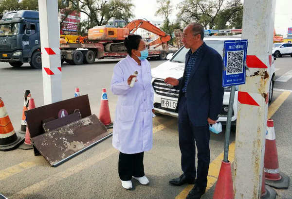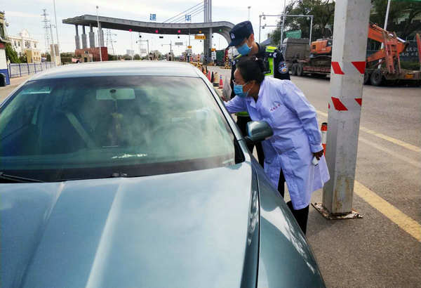 我院卡口值班人员对省外车辆内人员进行测温检查