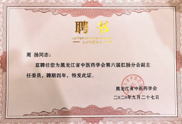 9月27日,黑龙江省中医药学会肛肠分会第六届换届大会暨2020年黑龙江省中医肛肠学术交流会在哈尔滨北大荒国际饭店举行,会上选举产生了第六届肛肠分会主任委员、副主任委员等职,我院肛肠外科主任周扬刻苦钻研技术,积极创新发展,理论技术水平不断提升,赢得了大会主委会的充分认可和肯定,光荣当选了黑龙江省中医药学会第六届肛肠分会副主任委员。