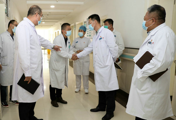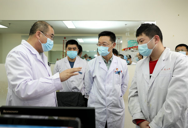 院领导们每到一处与科室主任、护士长及医护人员亲切握手、热情交流,仔细询问科室的疫情防控、学科发展、人才梯队、床位使用、收治病人数量及质量等情况,同时与医护人员共同探讨科室发展前景与方向,医护人员们更是集思广益向领导们分享疫情防控、科室管理等方面的成功经验和做法。