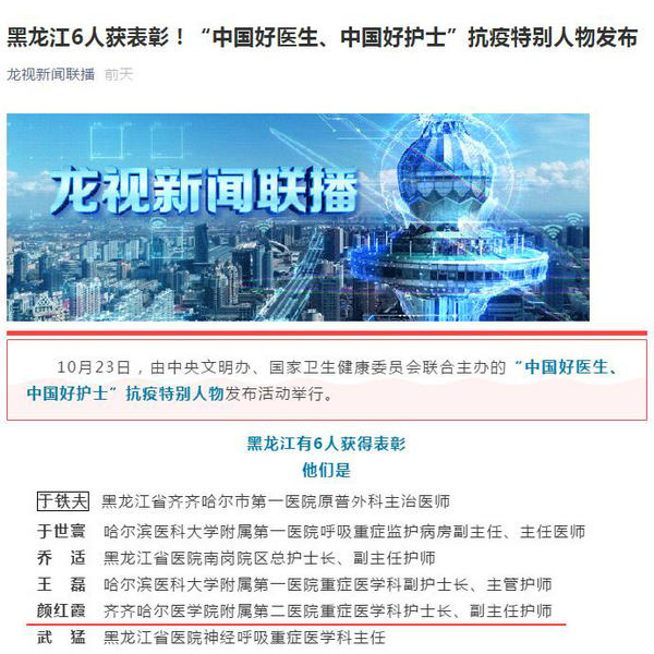 10月23日,由中央文明办、国家卫生健康委员会联合主办的“中国好医生、中国好护士”抗疫特别人物发布活动在华中科技大学同济医学院附属同济医院举行。我院重症医学科护士长颜红霞光荣当选“中国好医生、中国好护士”抗疫特别人物。