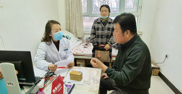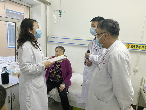 到达讷河市红光医院后,张主任立即投入到查房工作中,她认真询问每位患者的病史,仔细体格检查,分析各项化验报告,现场指导诊疗方案,同时还耐心地讲解疾病常识并给予饮食建议,鼓励病人及家属树立战胜疾病的信心。
