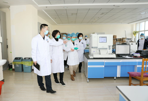 院长兼党委副书记武立刚、副院长鲍红光等查看血液实验室设备