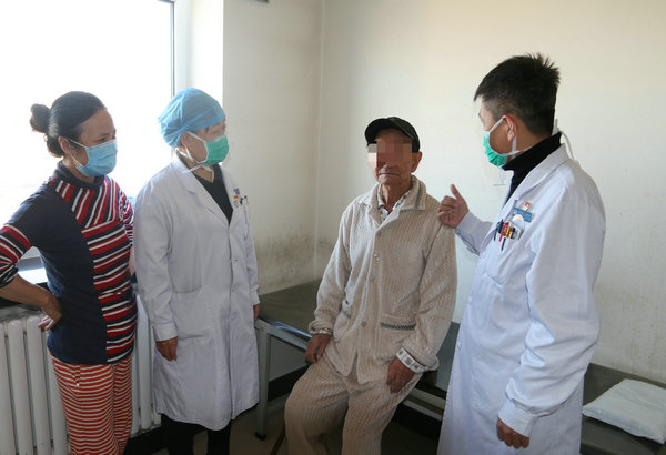眼科主任吴兢(左二)、宫学武为冯老先生做检查