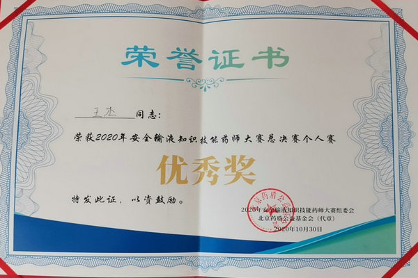 10月30日,由北京药盾基金会联合黑龙江、辽宁、吉林、重庆、四川、广东、河南、青海、新疆九省、市、自治区药学会主办,四川省华西医院协办,2020年“科伦杯”安全输液知识技能药师大赛总决赛在成都举行,药剂科主任于晓秋带领王杰代表黑龙江赛区赴成都参赛荣获优秀奖。