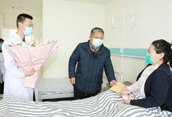 党委书记丁国旭、院长兼党委副书记武立刚为患病职工常慧康送慰问金和鲜花