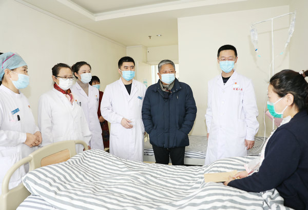 党委书记丁国旭、院长兼党委副书记武立刚、副院长赵玉环等到病房探望慰问患病职工常慧康