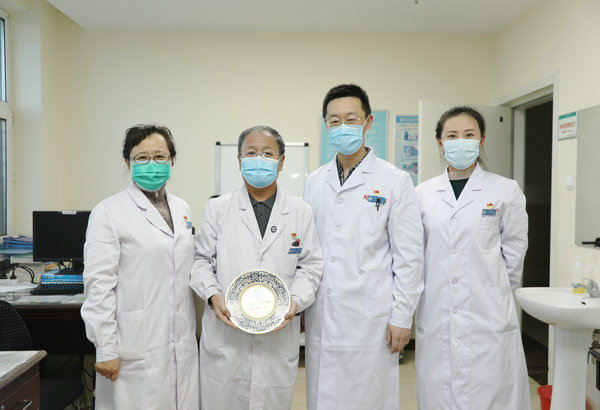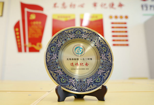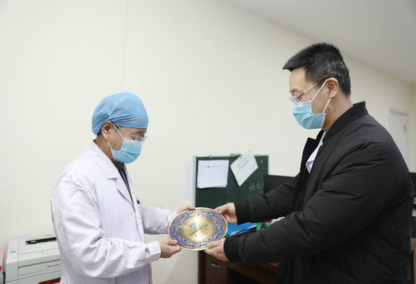 12月31日上午,院长兼党委副书记武立刚、副院长赵玉环、工会副主席韩秀丽来到神经内科一病区医生办公室,看望即将荣退职工周洁信主任,武院长代表医院向周洁信主任赠送镶有赠言的青花瓷盘纪念品。