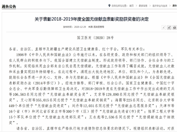 12月25日,国家卫生健康委、中国红十字会总会、中央军委后勤保障部卫生局联合发布了国卫医发〔2020〕28号《关于表彰2018-2019年度全国无偿献血表彰奖励获奖者的决定》文件通知,我院荣获2018-2019年度全国无偿献血促进奖单位奖。