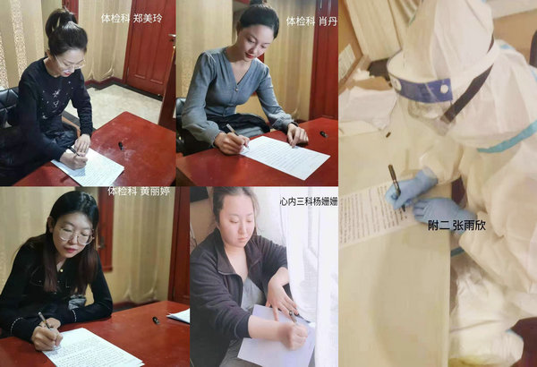 “我是一名普通的护士,作为附属二院支援富区隔离点的护士,我感到肩上的责任重大,请党组织考验我!我会以一名共产党员的标准要求自己,很好地完成这次任务,以实际行动争取早日入党。”“今年疫情复杂多变,战疫前线急需护理人员,作为一名医务工作者,我们很荣幸参加支援富区隔离点任务,相信我们一定会打赢这场无硝烟的战争。”