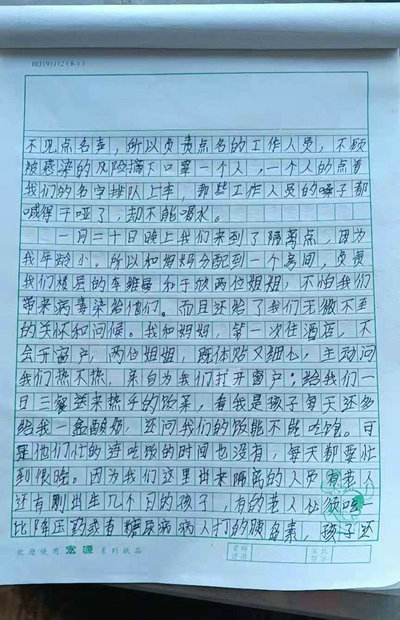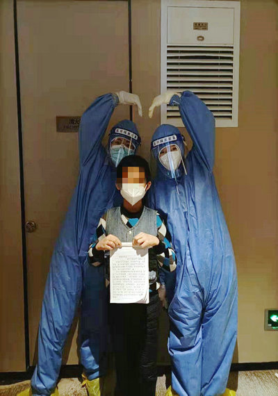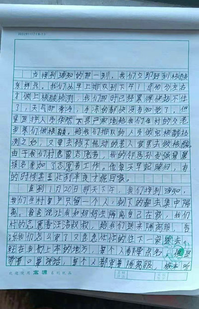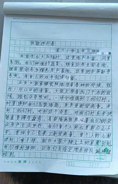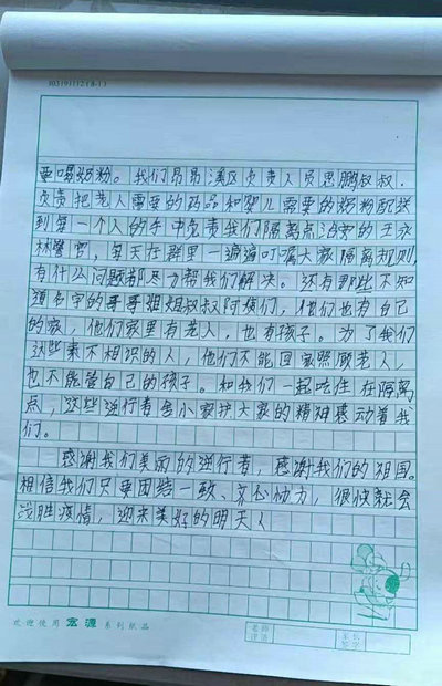 最近几天,住在9楼的一个小男孩引起了我们的注意,他是一个特别听话懂礼貌的小男孩,我和我的搭档敲他的门时,打开房门,他每次都会冲着我们微笑说着:“姐姐们辛苦了”。无论是采核酸、测体温、送餐……他都会积极主动的配合着我们的工作,这可能就是忙碌中的暖心和感动。今天我们收到了一份特殊的礼物,为了感谢我们,小朋友写了篇题为《致敬逆行者》的作文,没有炫丽的词藻,没有华丽的修饰,只是一篇普普通通字里行间包含着小朋友真挚感情的作文,很荣幸我们能成为他文章里的最美逆行者,很欣慰作为一名白衣天使得到了他们的认可,付出再多的辛苦,都是值得的。