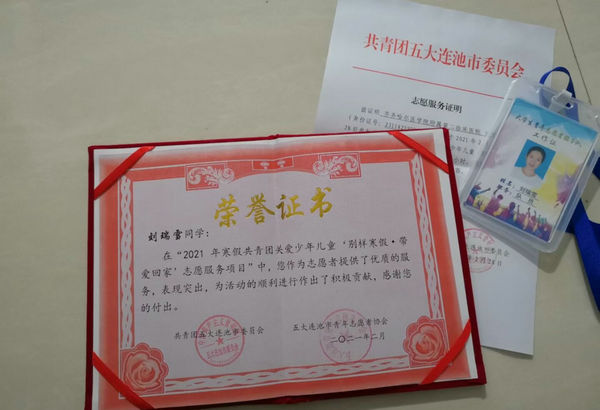 在邻里守望志愿服务活动。刘瑞雪同学积极响应属地政府部门号召,在做好个人防护的前提下,深入社区,参加共青团关爱少年儿童‘别样寒假•带爱回家’活动,用守望相助编织社区爱心网,为城市流动儿童提供生活照顾、学业辅导、自护教育等服务,让孩子们感受到社会的温暖。