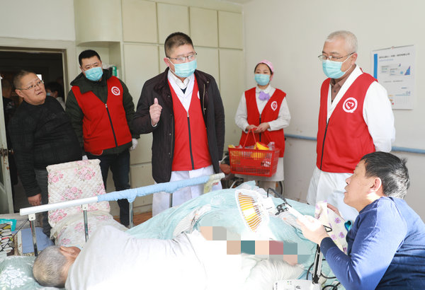 肛肠外科主任、市助艾爱心协会会长周扬、肛肠外科护士长宋玉平为卧床老人测量血压