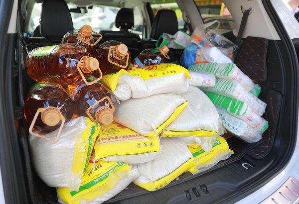 肛肠外科主任、市助艾爱心协会会长周扬自费购买的大米、豆油等生活物资