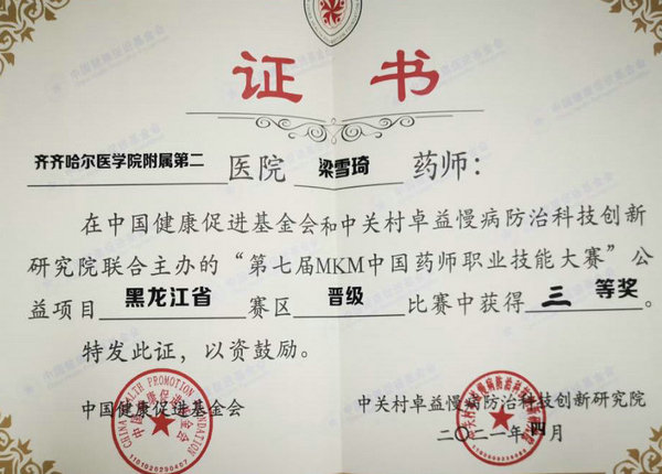 近日,由中国健康促进基金会、中关村卓益慢病防治科技创新研究院联合主办的“第七届MKM中国药师职业技能大赛”黑龙江省赛区中,我院药学部药师孟巧惠、梁雪琦代表医院参赛荣获三等奖,为医院争得荣誉。