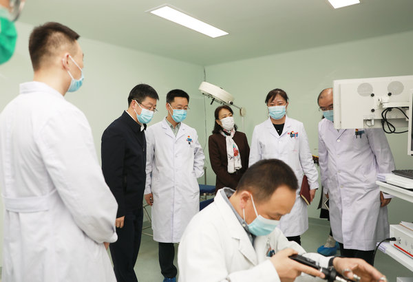 汇报座谈结束,方传龙院长等调研组一行在丁国旭书记、武立刚院长等人陪同下,实地走访视察了临床技能中心、门诊、急诊、肿瘤外科、血液风湿科和康复医学科及精神卫生中心等地。