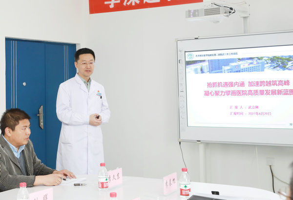 武立刚院长以《抢抓机遇强内涵 加速跨越筑高峰 凝心聚力擘画医院高质量发展新蓝图》为题,从全院发展现状、质量运营、绩效考核、党建宣传、学科建设、医院管理、疫情防控、问题困难及2021年工作计划等方面作了全面总结汇报。调研组听取汇报后,就医院未来发展同与会人员进行了深入交流座谈。武立刚院长、丁国旭书记、鲍红光副院长等结合医院实际,相继发表了想法和意见。