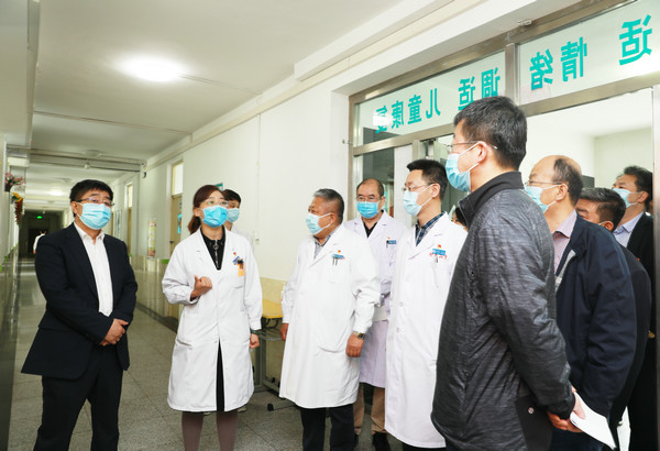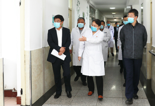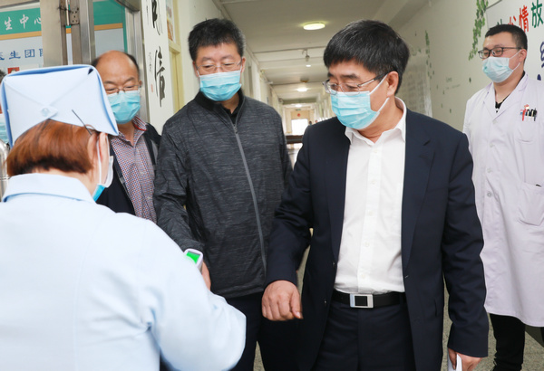 学院党委书记顾长虹、院长方传龙、党委副书记崔光成进入病区测量体温