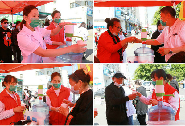 医院工作人员及志愿者为考生及市民发放饮用水