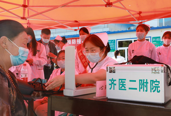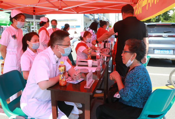 医务人员为市民测量血压