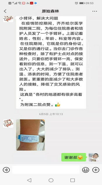 患者侯先生在表扬信中说:“当你去门诊做各种检查时,除了有护士点对点的接送外,只要你腕带一亮,保安看到你的信息,测一下温,就可以出入了,大大的减少了排队、测温、填表的时间,方便了住院患者就医。更重要的是减少了和大多数人的接触,降低了交叉感染的风险,我为附属二院点赞。”