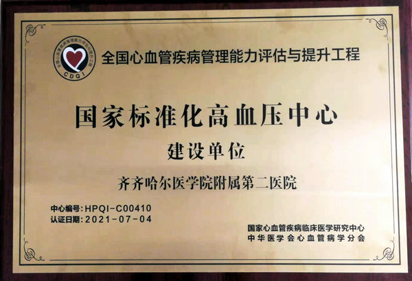 国家标准化高血压中心建设单位牌匾