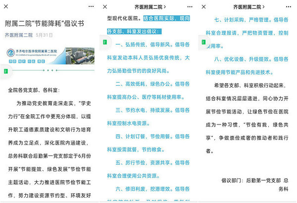6月初,后勤第一党支部联合总务科向全院发出“节俭增效,绿色发展”的倡议书,各支部、科室迅速响应号召,分别以早会、例会或科室工作微信群的形式进行了动员和传达,通过宣教、研讨、规划、革新、文明管理等措施自觉提升节俭行为,体现在工作、生活、学习、社会服务等各方面,全院职工节俭意识得到巩固与提高。