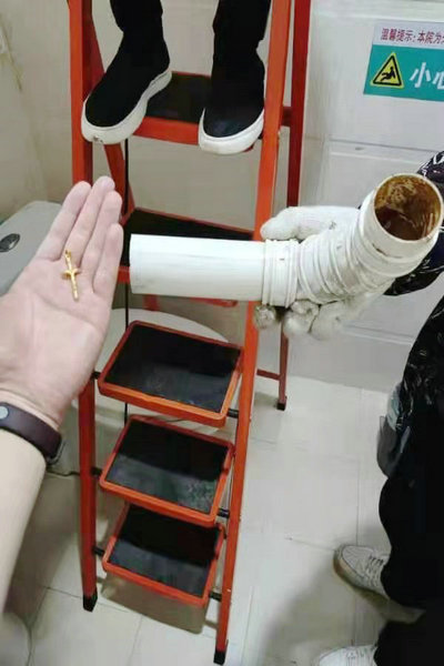 接到心血管内科一病区主任张红岩电话后,总务科副科长孙超宇立即联系到水暖班人员,亲自带领于德雨、刘磊两名职工到达病房进行紧急处理,经过现场查看分析认为项链吊坠应该滑入楼下病区的下水管道弯头外,但是项链坠小,找到的希望并不是很大,还要对楼下棚板及下水管道进行破坏处理才能进行寻找。因项链是近期新买的,不仅昂贵而且对刘女士有着特殊的意义,看到刘女士焦急的神情,决定破坏管道帮助李女士尽最大可能找到项链。